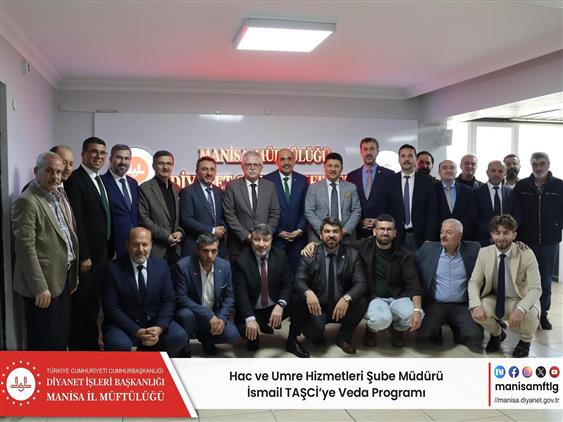 Manisa İl Müftülüğünde Hac ve Umre Hizmetleri Şube Müdürü olarak görev yapan İsmail Taşci’nin İzmir İl Müftülüğüne tayini dolayısıyla veda programı düzenlendi. Programa İl Müftüsü Şükrü Kabukçu ve mesai arkadaşları katıldı. İl Müftüsü Kabukçu, Taşci’ye hizmetlerinden dolayı teşekkür ederek yeni görev yerinde başarılar diledi.